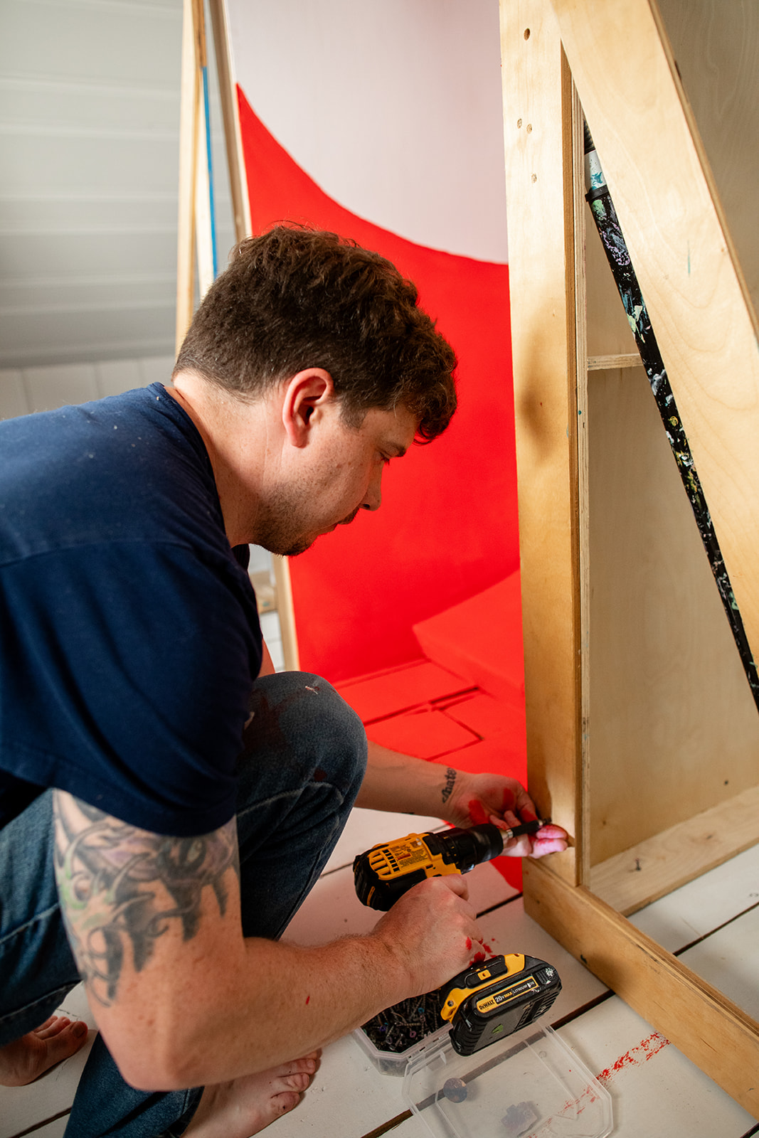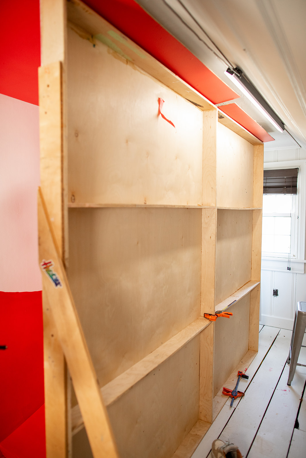 We painted the walls white, which was straightforward, and then painted the slide a bright red. But once everything was blocked in, the balance felt off. There was way too much white. To solve that, we decided to extend the curve of the slide onto the walls using red paint, which would both bring more color into the space and exaggerate the shape of the slide itself. That decision ended up being the most uncertain part of the entire build.
