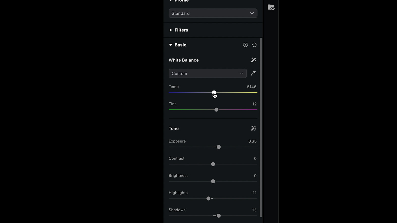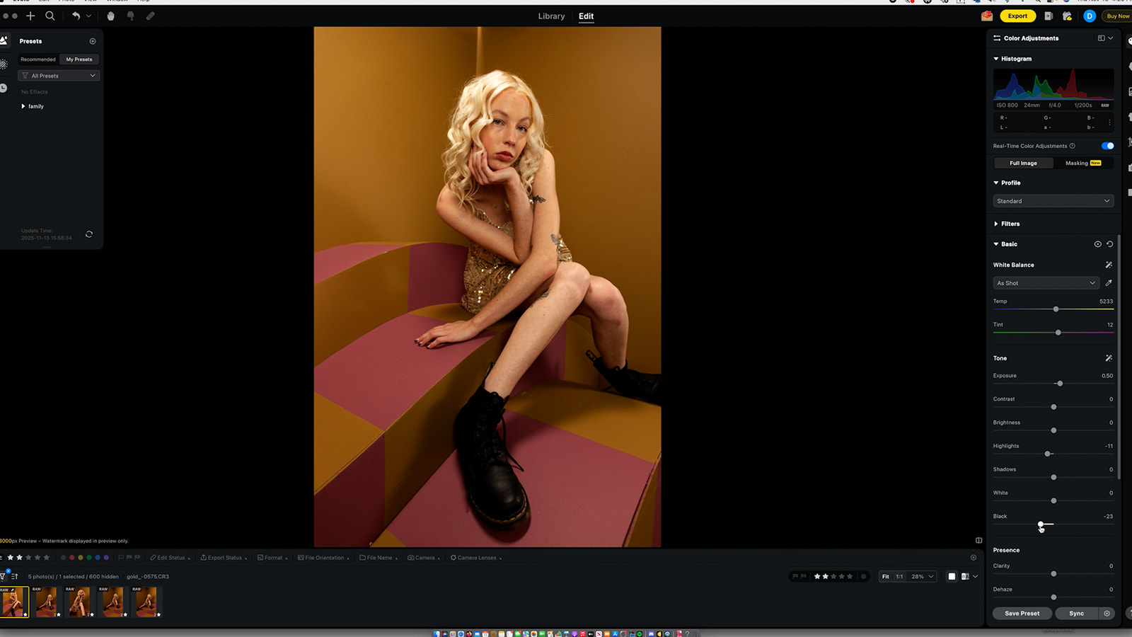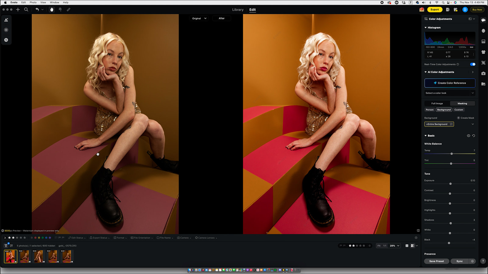 I start with the basics: exposure, highlights, blacks, and overall temperature. Rich blacks always help our images pop, and from there I nudge the tint until the base feels right. The before/after button in Evoto is really helpful and I’m constantly clicking it as I go to make sure the edit feels balanced and the photo is moving in the right direction.